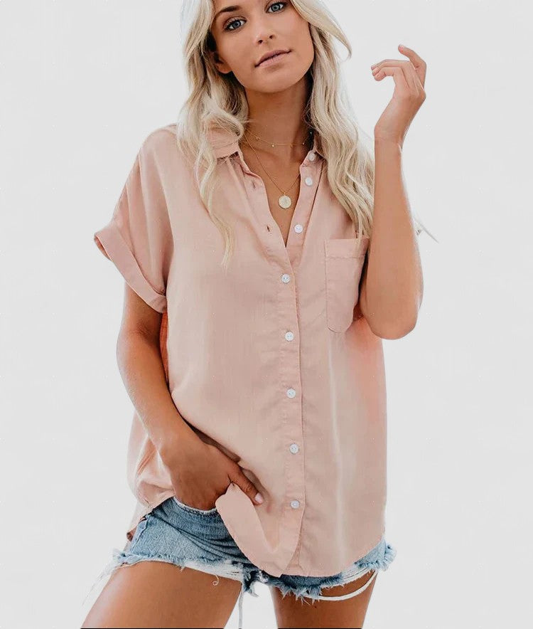 Bluza Aletta îmbină confortul și eleganța, fiind piesa esențială pentru orice garderobă. Cu o croială relaxată, închidere clasică cu nasturi și mâneci răsfrânte, oferă un look sofisticat fără efort.